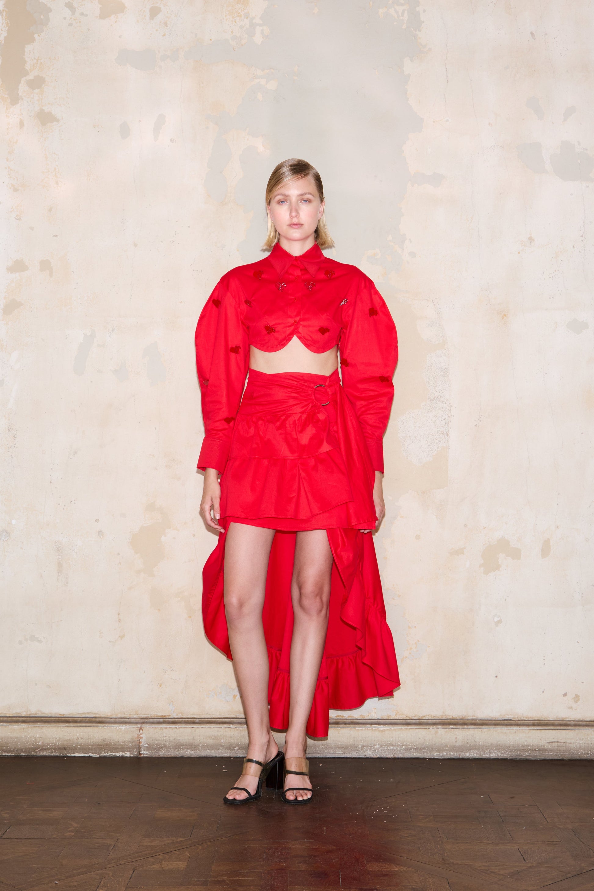 Irregular skirt with ruffles, irregular short front ending in a long ruffled back. It closes with a strap that allows adjusting in waist and a silver metal saddle metallic ring.