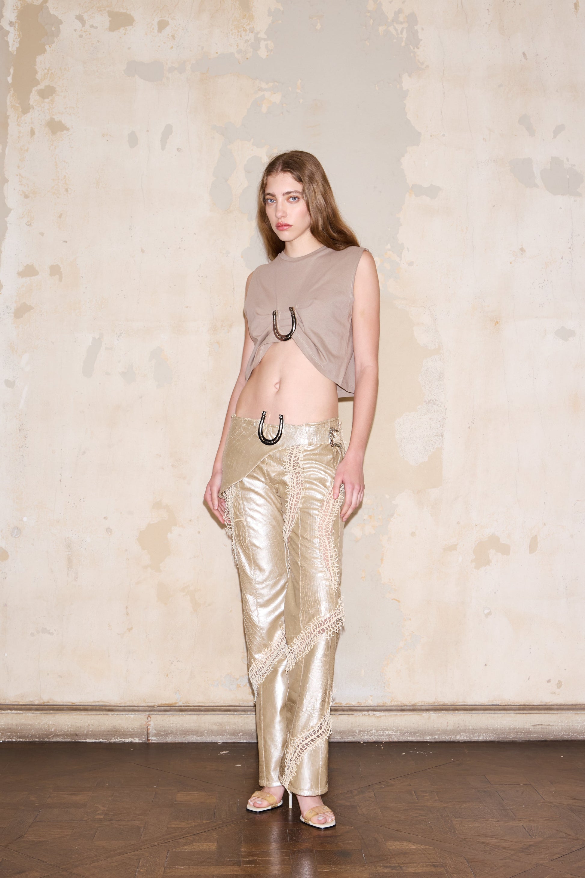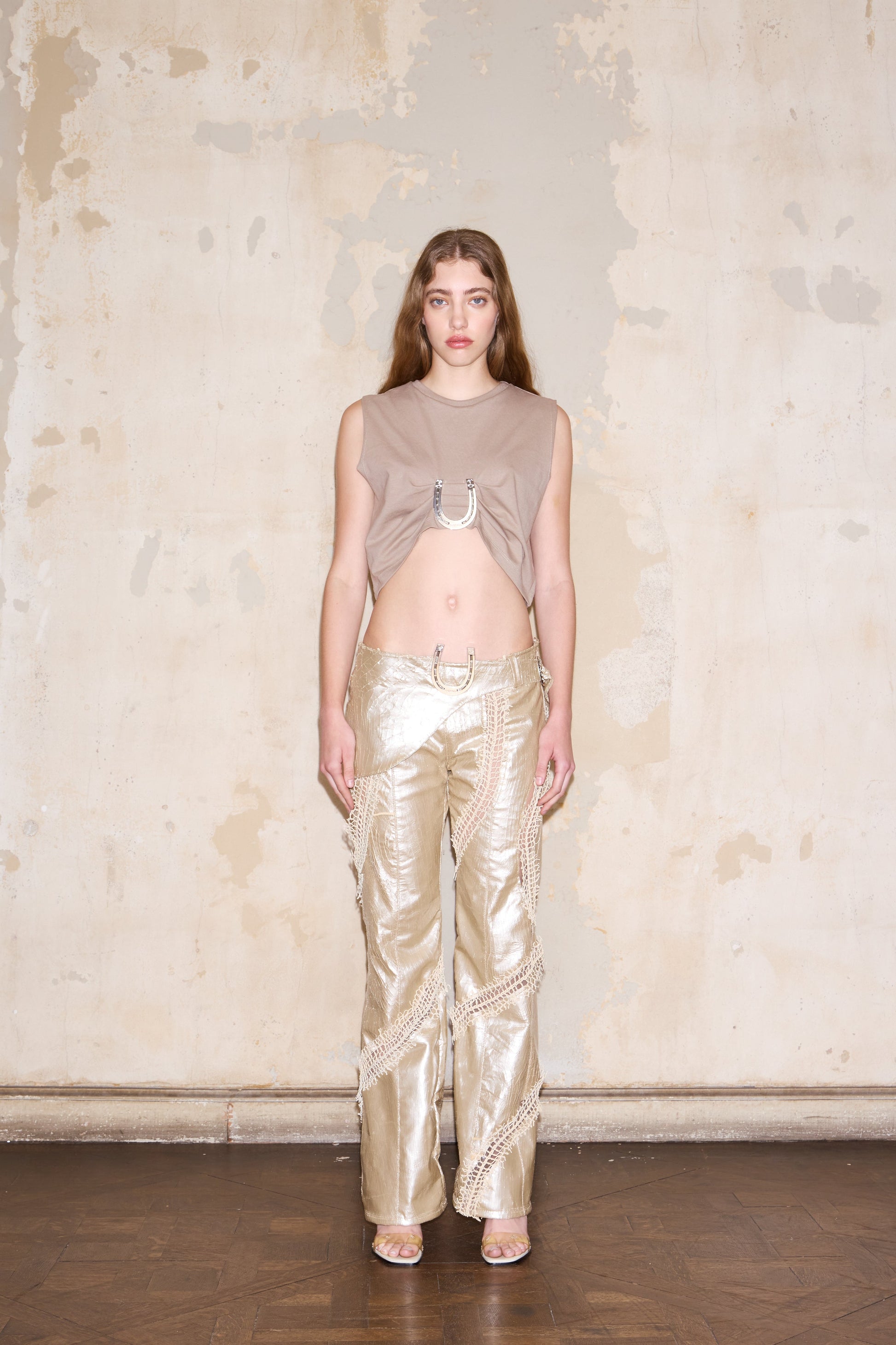 Crafted from pure cotton, this sleeveless crop top features an elegant draped front and distinctive horseshoe-shaped corner accents. The minimalist silhouette offers versatile styling potential for contemporary wardrobes.