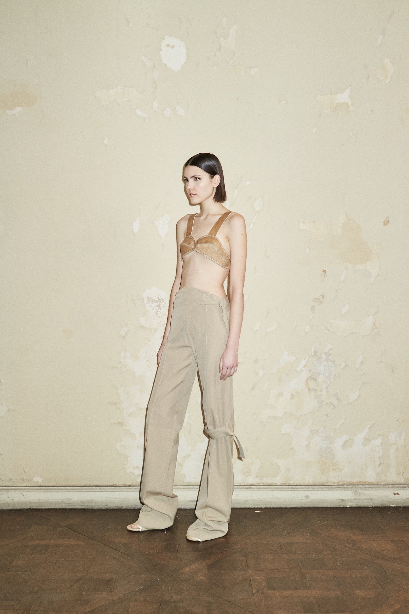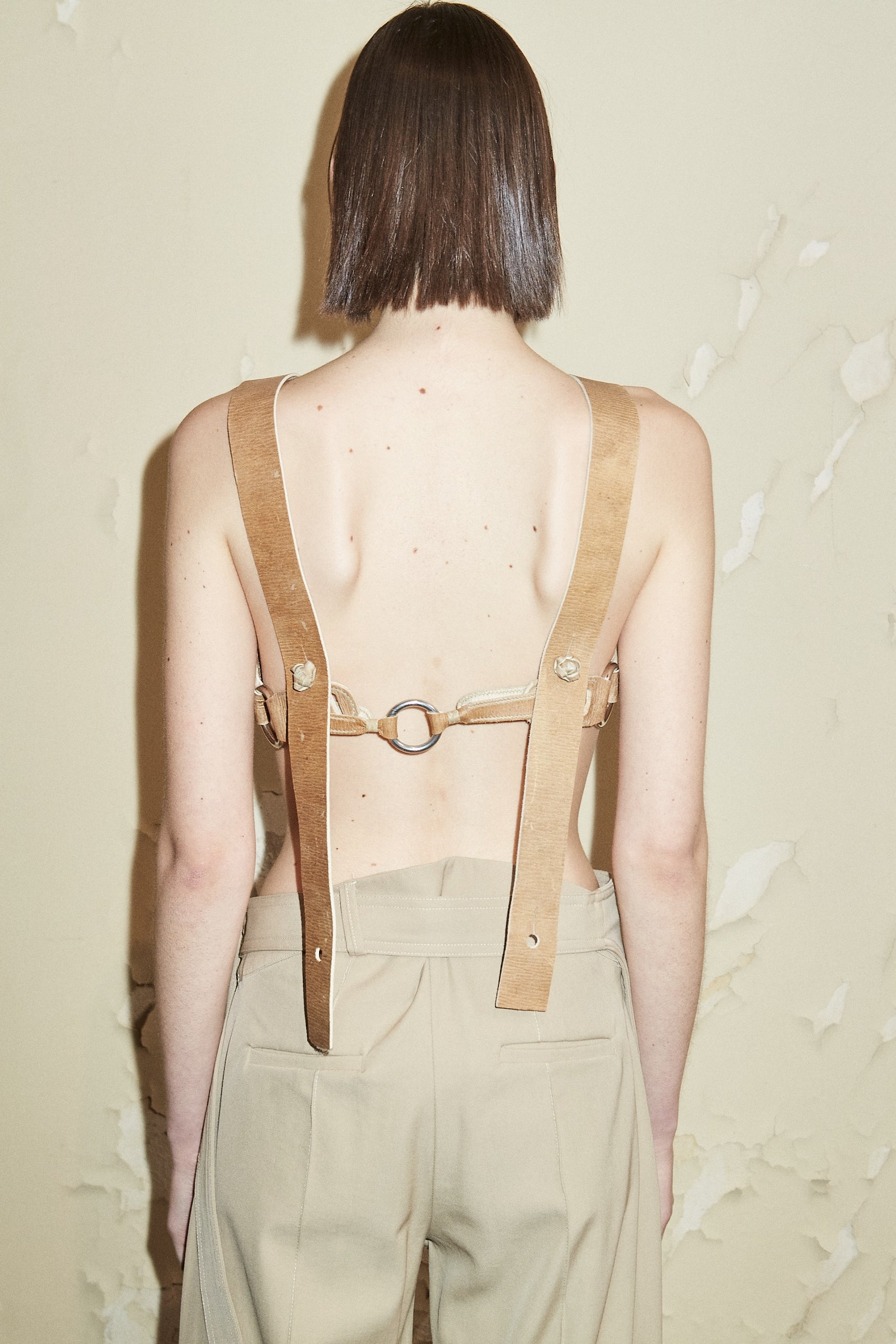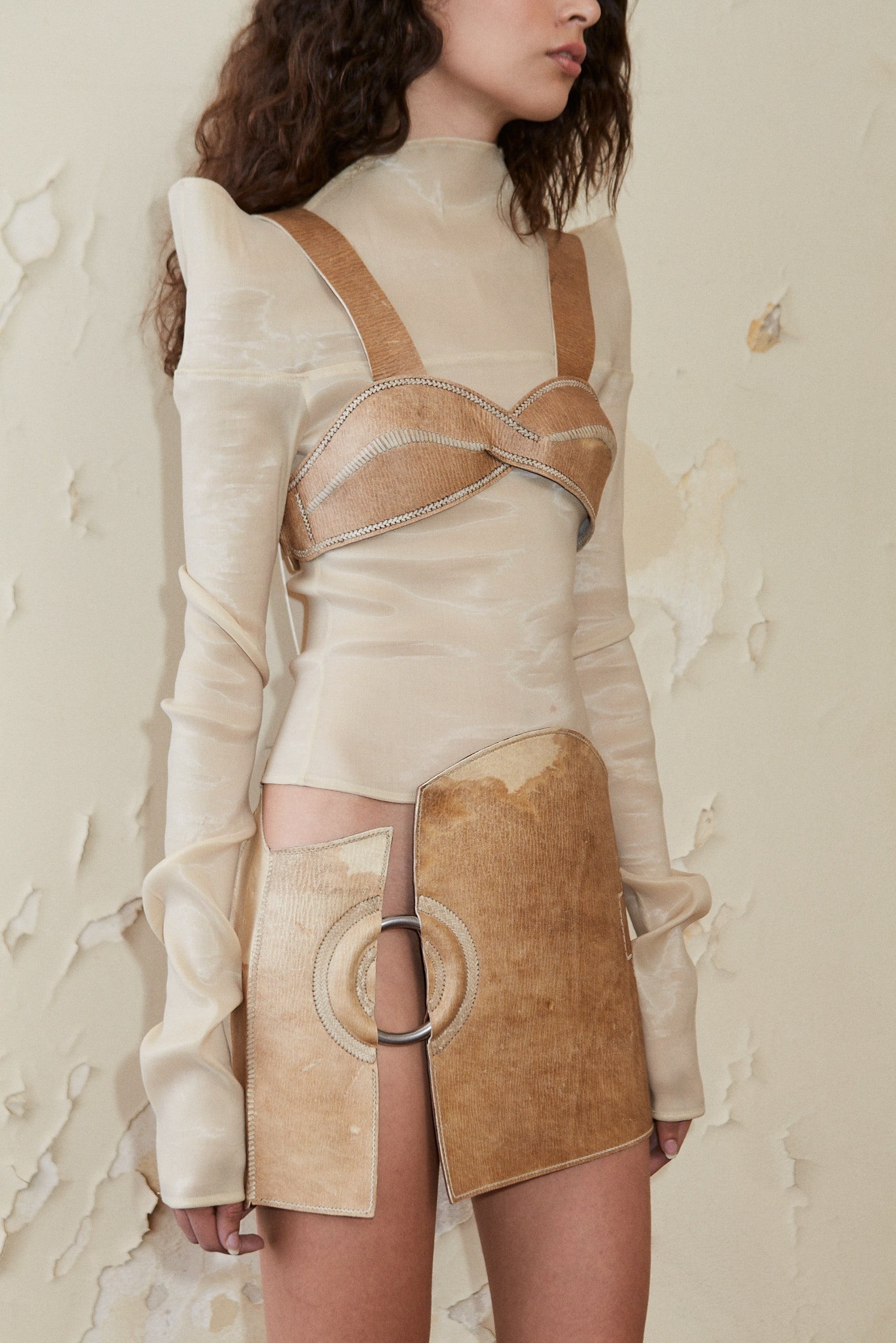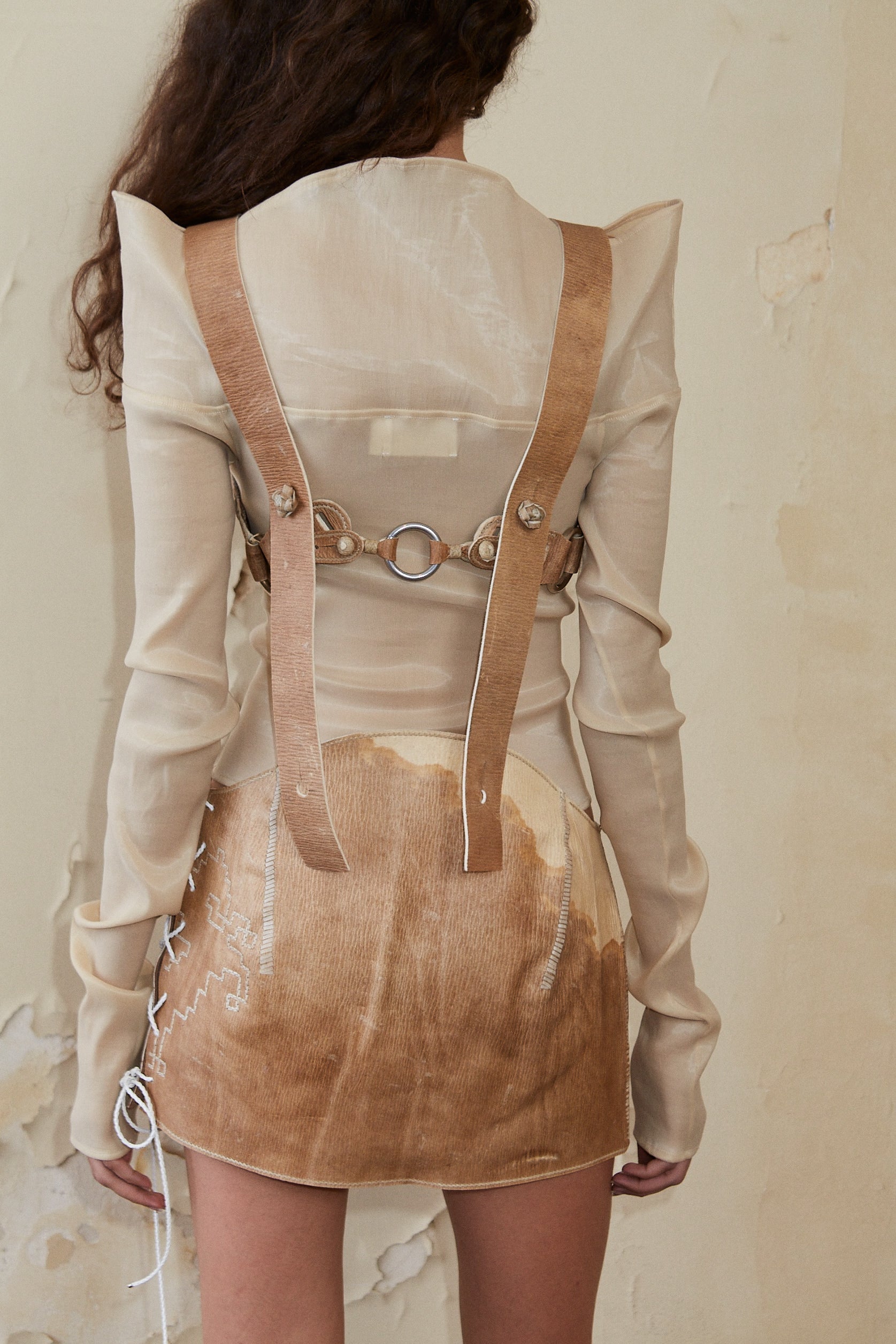 Belted top turned into a bustier. Fastens in the back with a Manea: basic tool of the gaucho used to work with horses. This is an adjustment system that uses a "manea" that fastens with 2 leather loops that at the same time take a steel ring.
