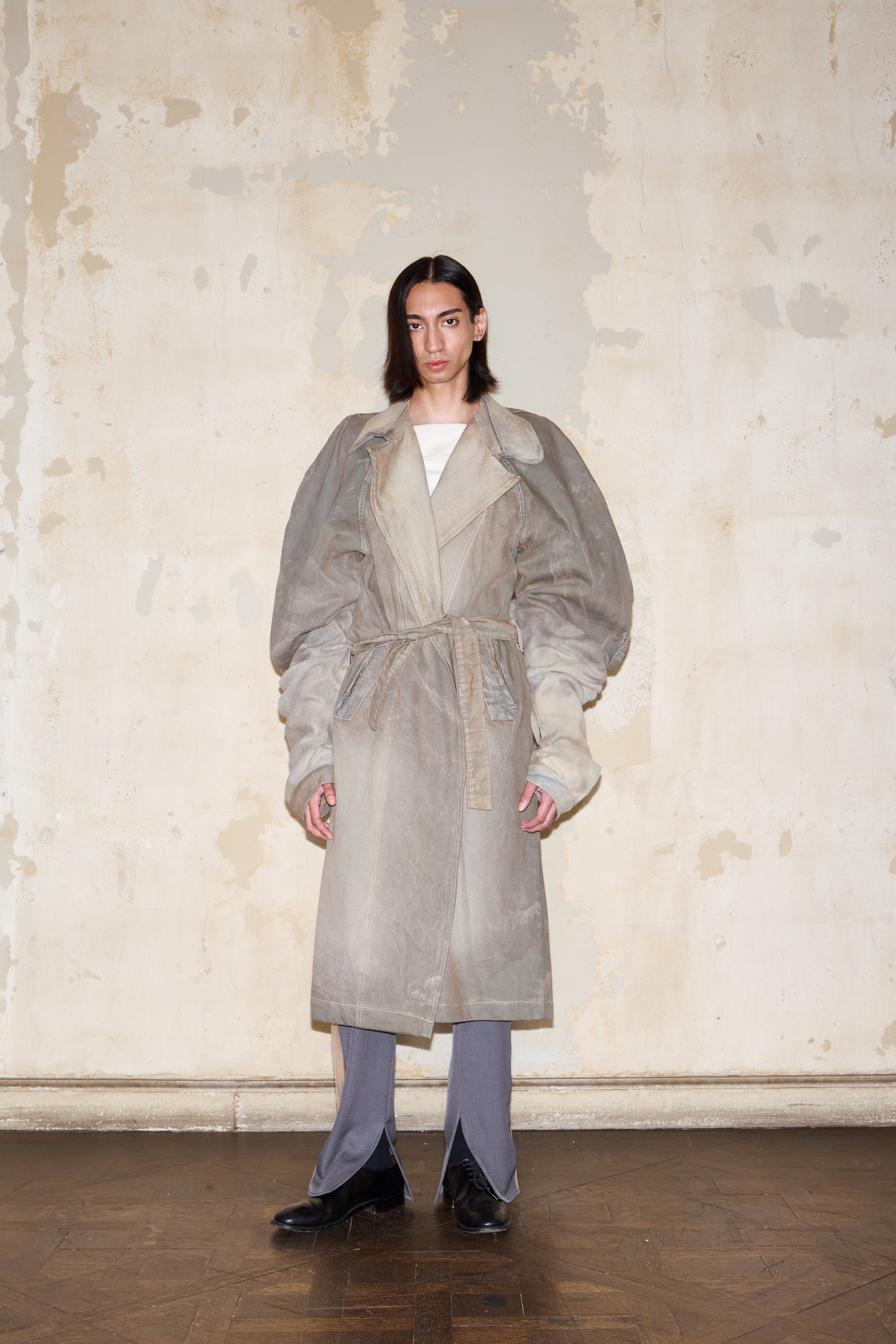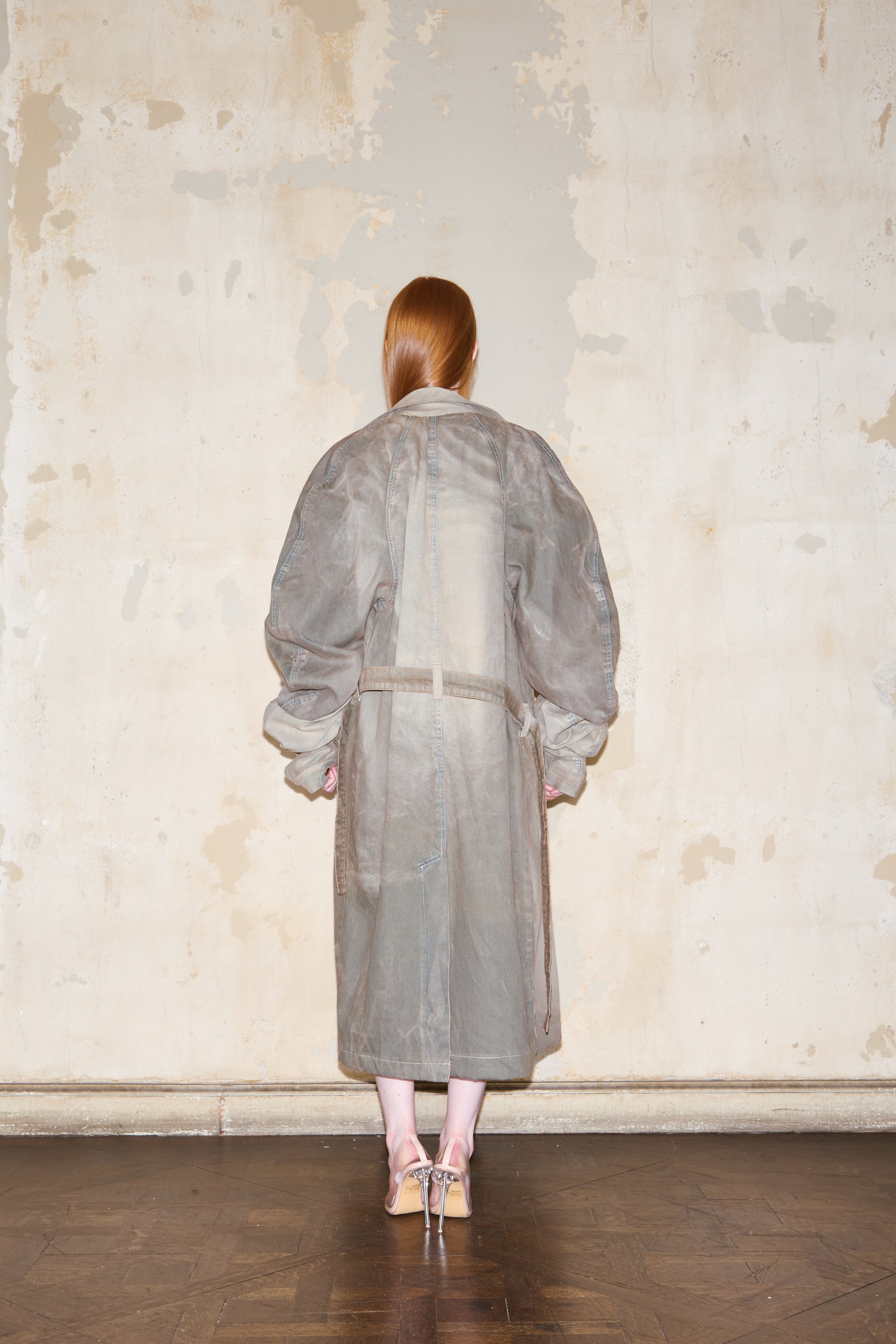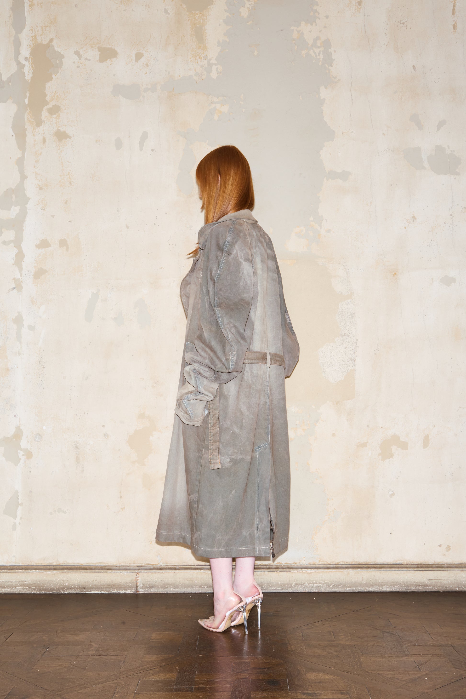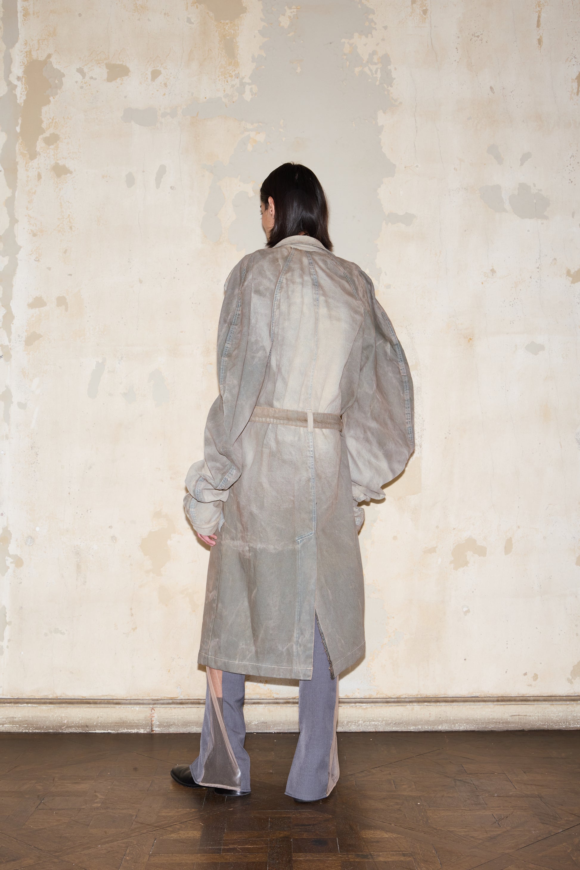 Oversized denim trench in oxidized green featuring dramatically voluminous collapsed sleeves. Versatile design allows to wear it as a skirt. Hand wash in cold water only.