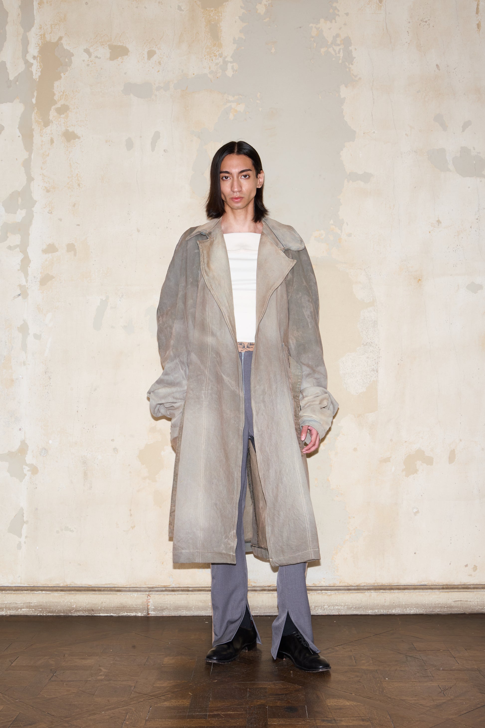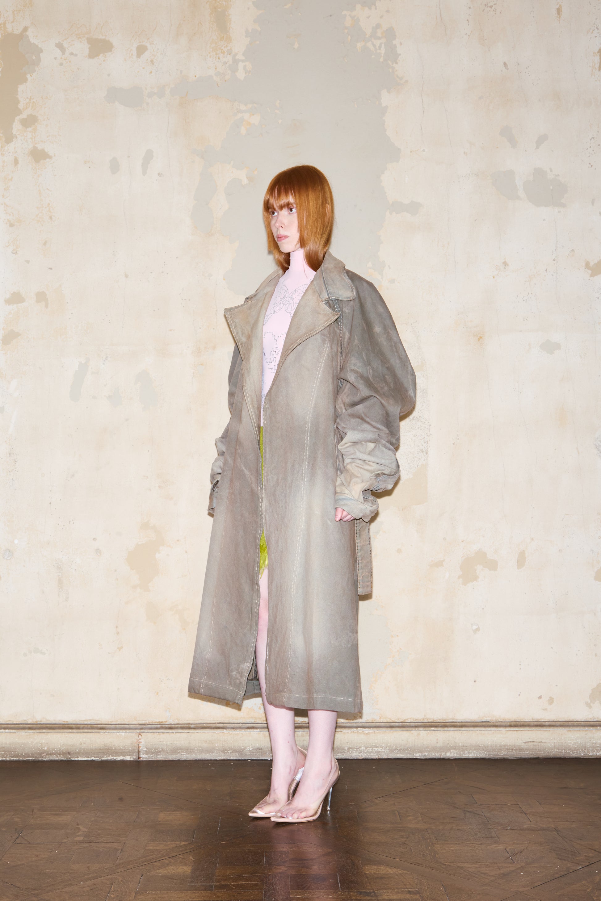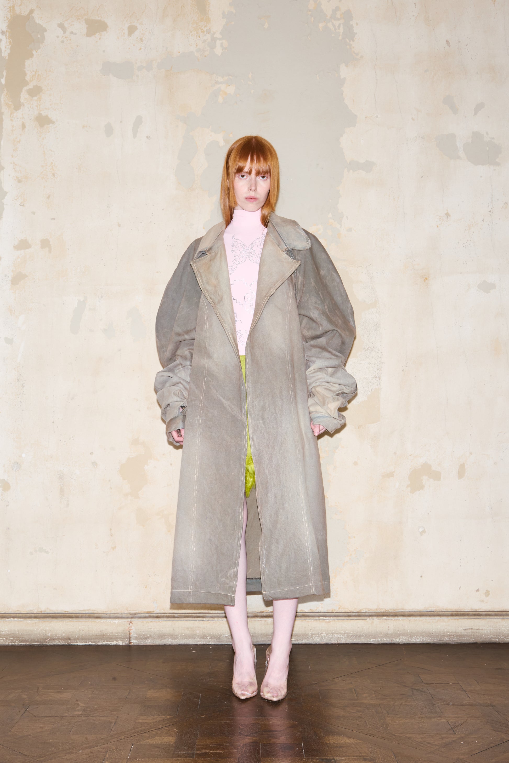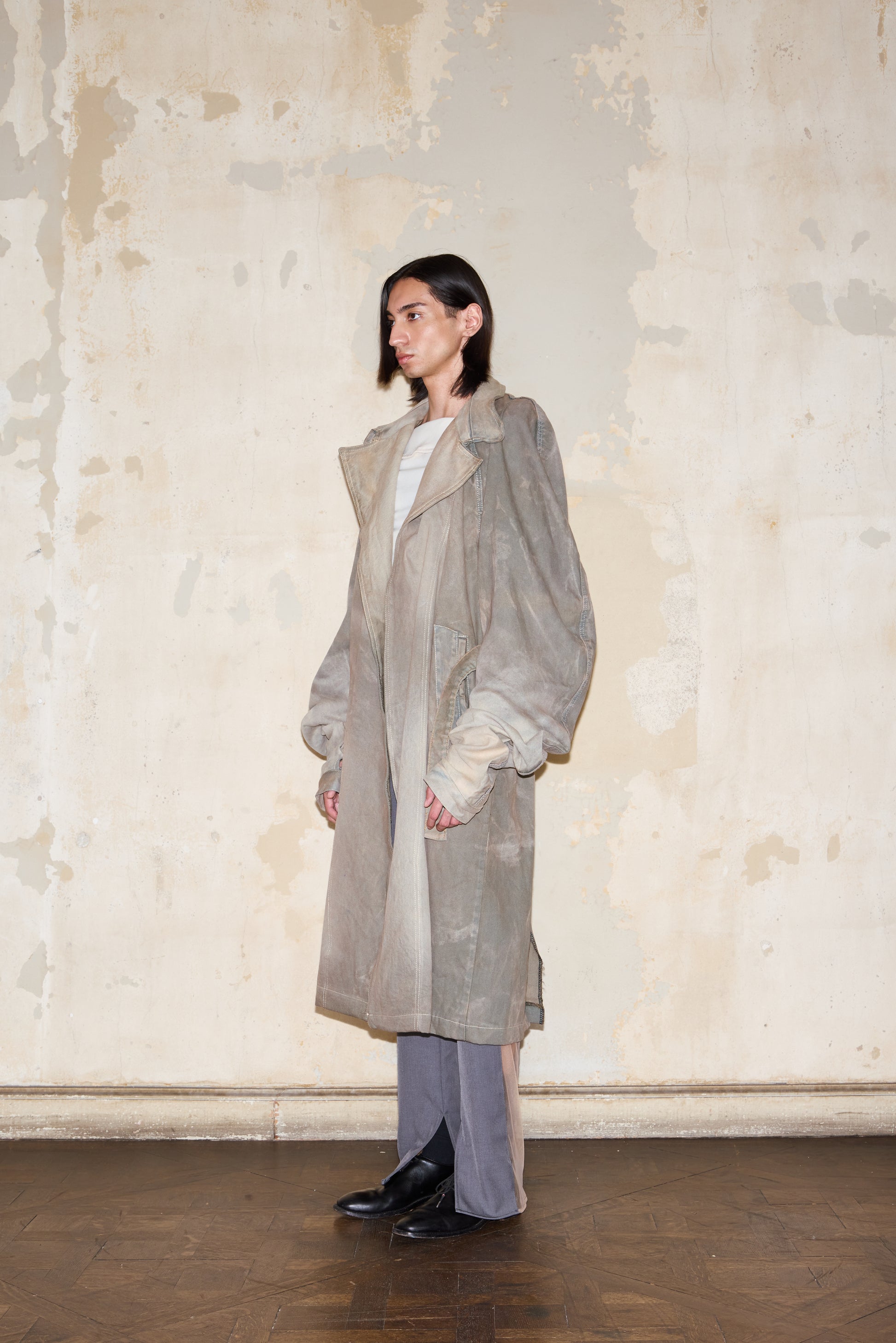 Oversized denim trench in oxidized green featuring dramatically voluminous collapsed sleeves. Versatile design allows to wear it as a skirt. Hand wash in cold water only.