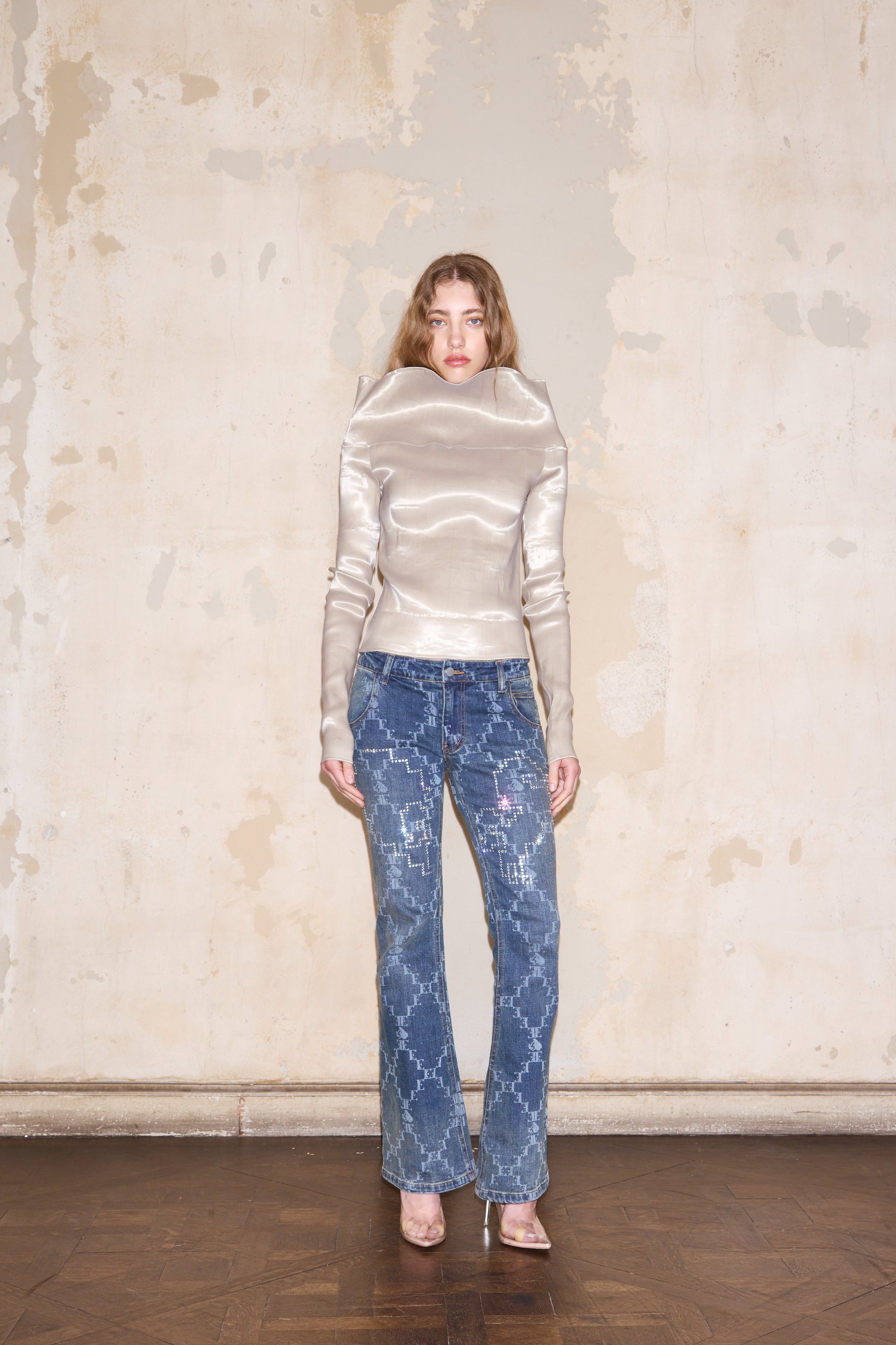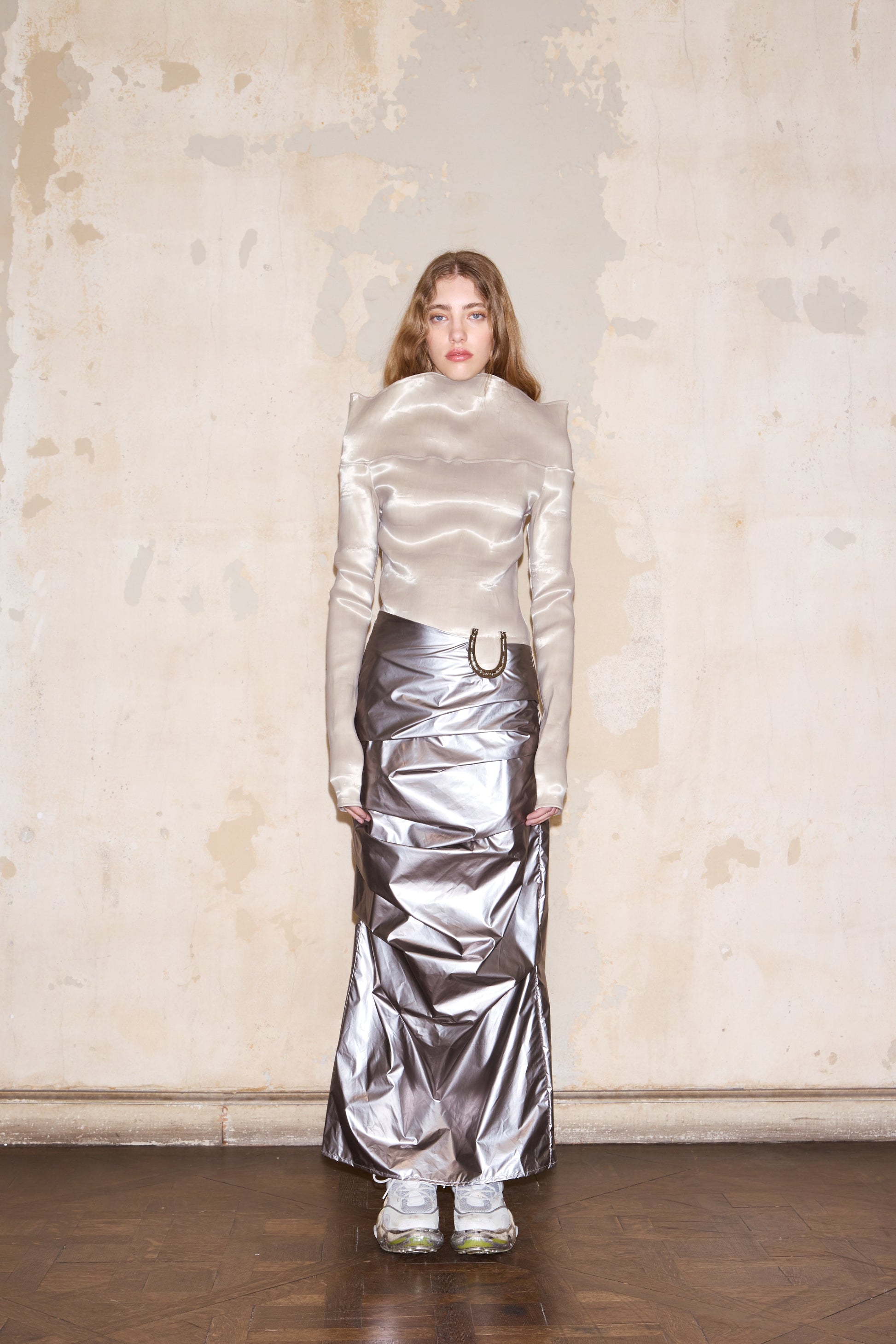 Top al cuerpo en género de organza técnica elastizada con brillo. La tela es texturizada con líneas en su trama. Cuello bote irregular más alto en el frente y espalda que puede usarse subido o doblado. Mangas largas.