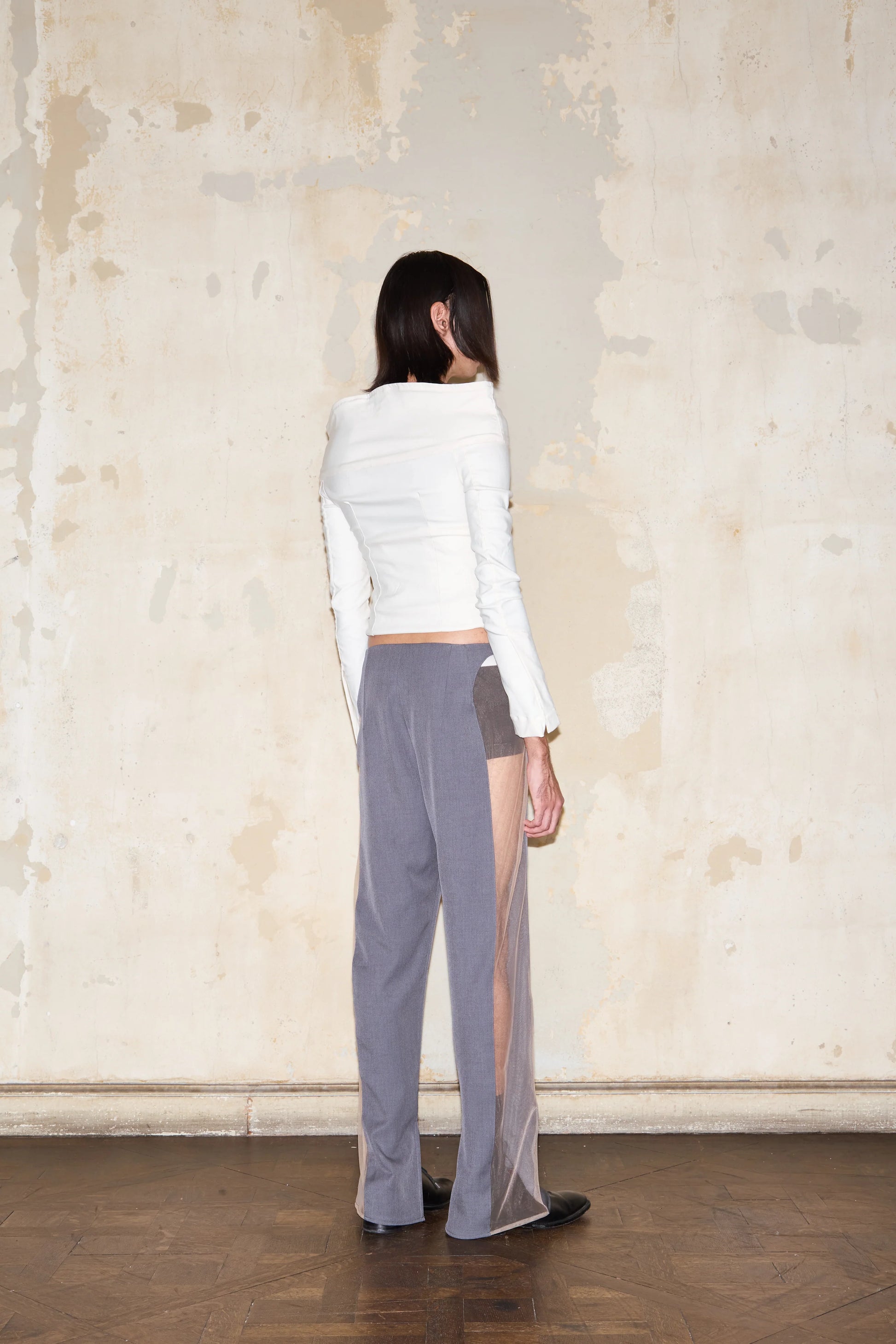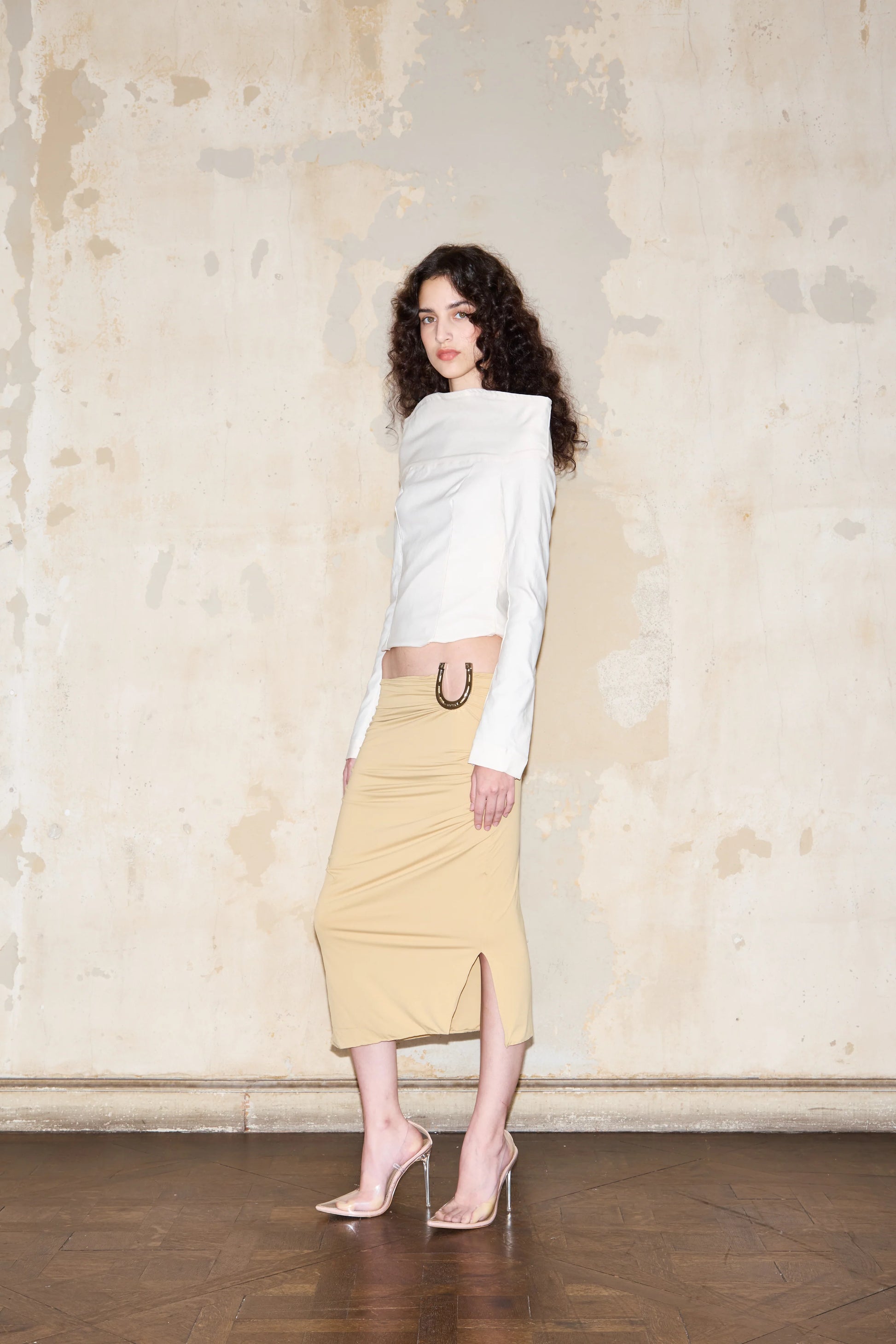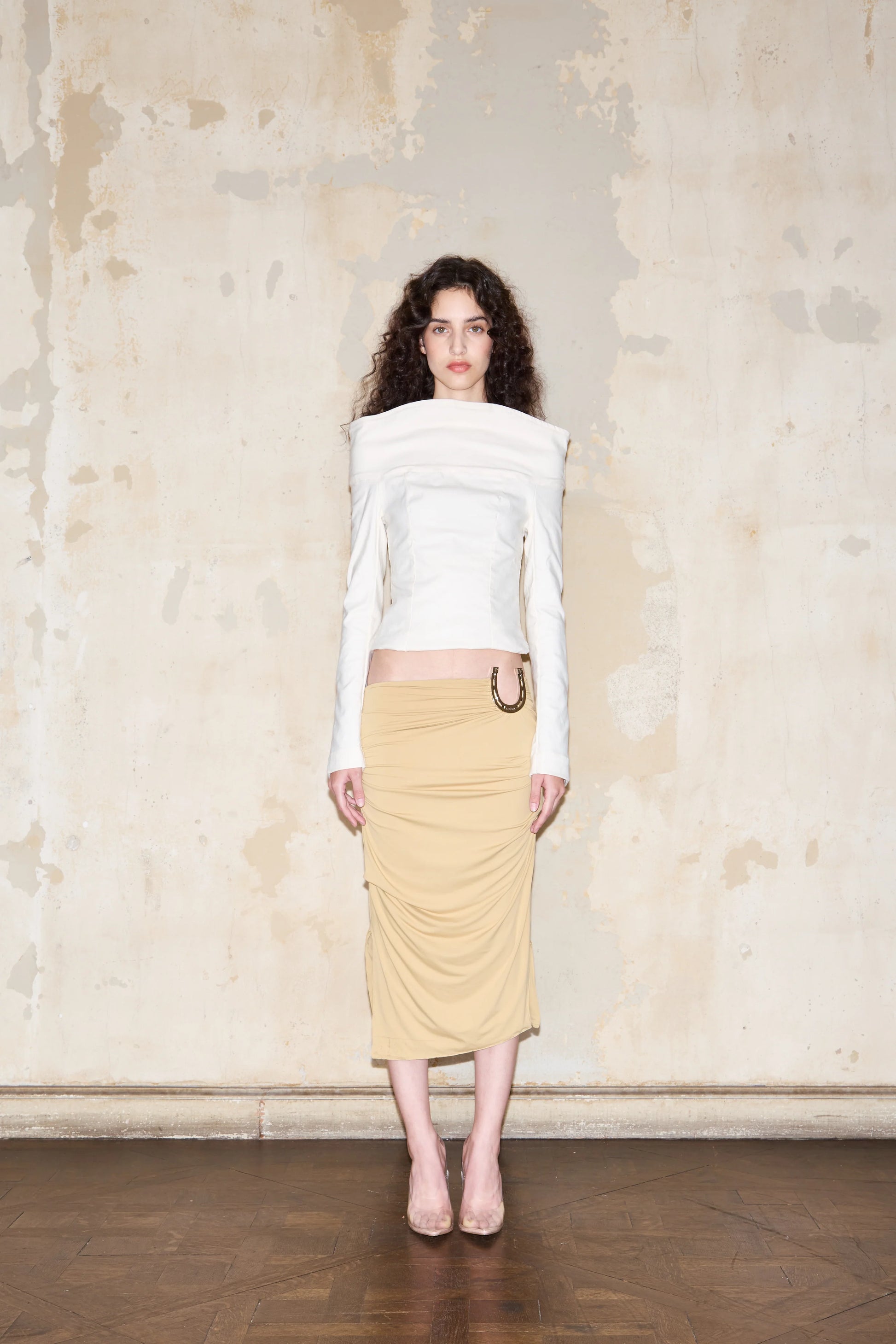 Form-fitting top crafted from washed denim featuring an asymmetrical boat neckline with elevated front and back sections that can be styled upright or folded down. Constructed with long sleeves.