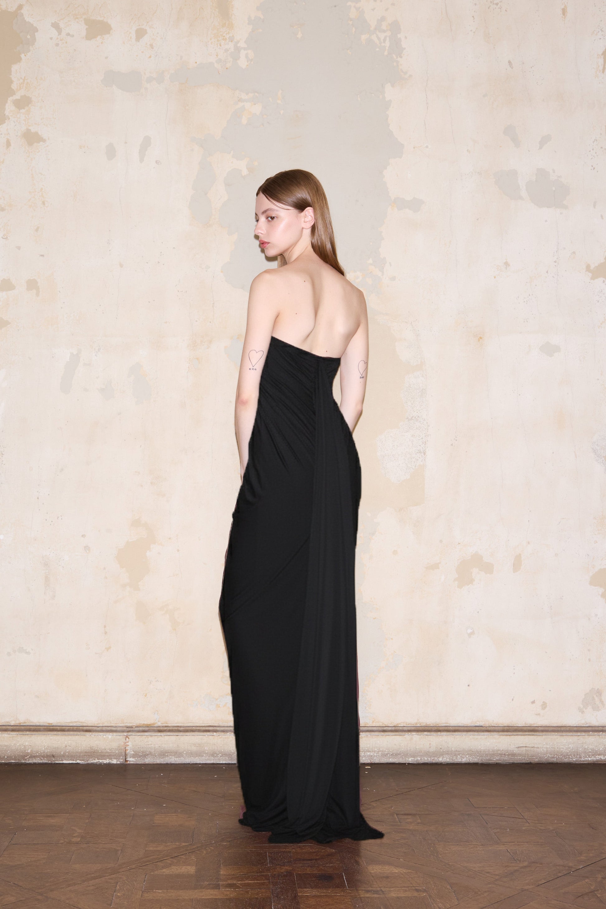 Sophisticated strapless evening gown featuring the iconic ESQUINA horseshoe detail at the neckline. Crafted from premium Italian silk jersey, this timeless piece delivers refined elegance and graceful draping. Hand wash in cold water to maintain fabric integrity.