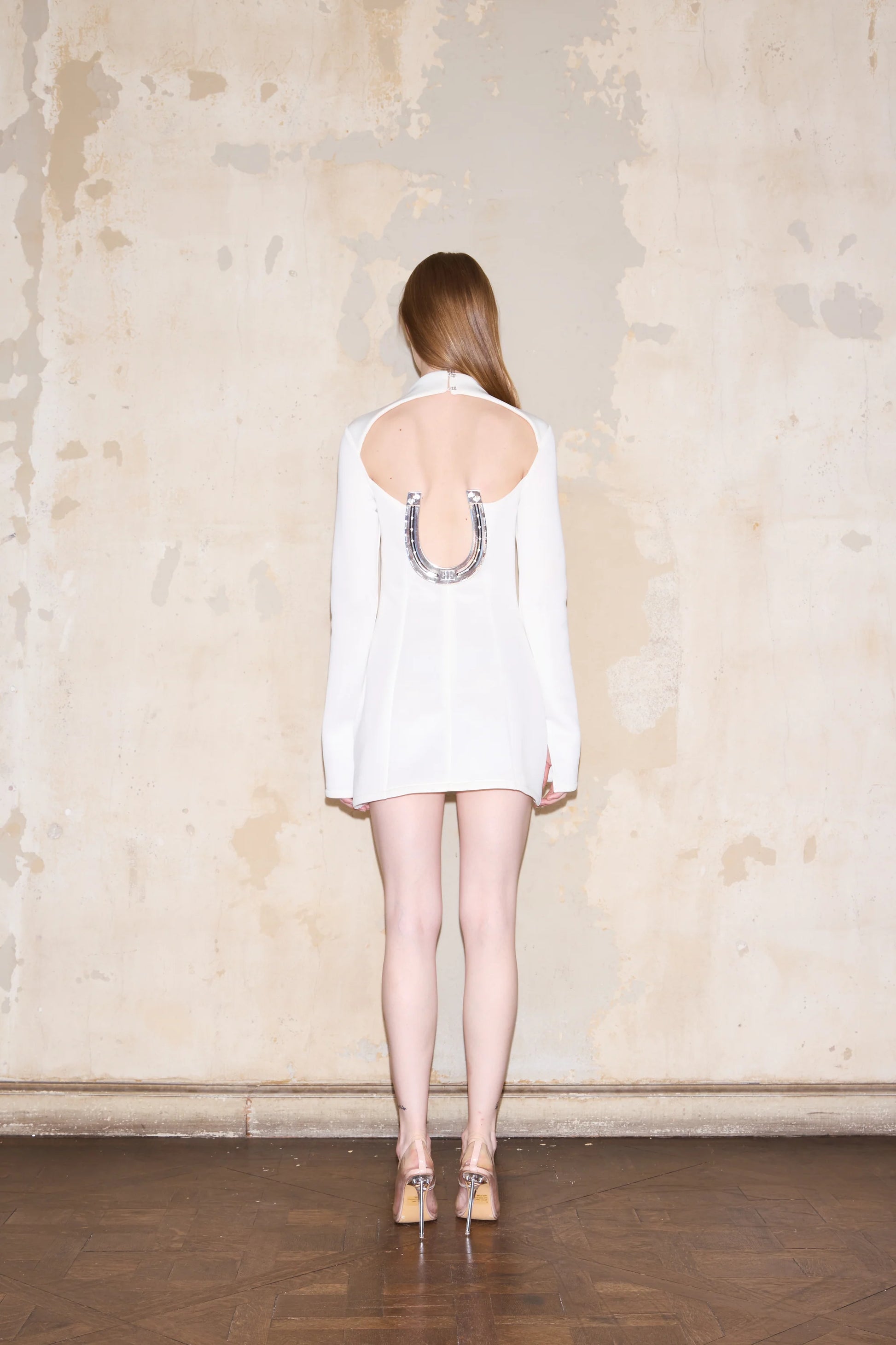 Short dress with a defined structure, long sleeves, and a semi-high neckline. Features tailored front pockets and an open back highlighted by a large ESQUINA horseshoe-shaped detail. Made from Italian-manufactured technical fabric.